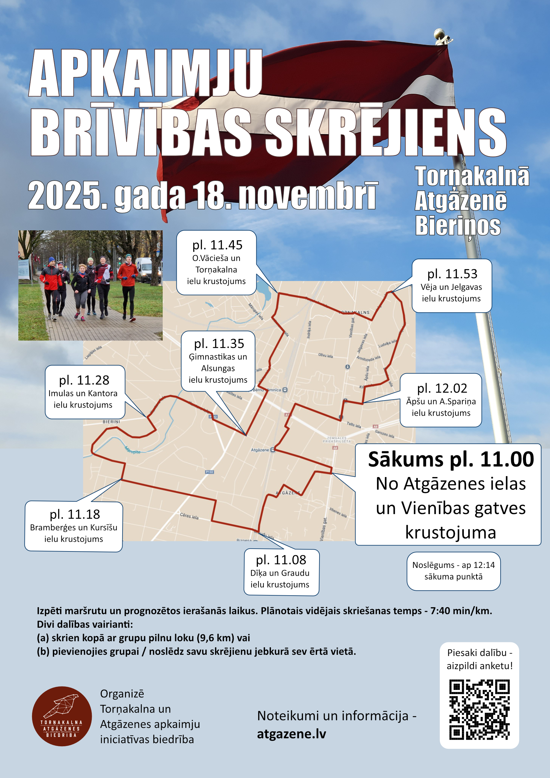 Tiekamies 2025. gada 18. novembrī pl. 11.00, lai piedalītos otrajā Apkaimju Brīvības skrējienā. Skriesim ne tikai Atgāzenē un Torņakalnā, bet arī Bieriņos.